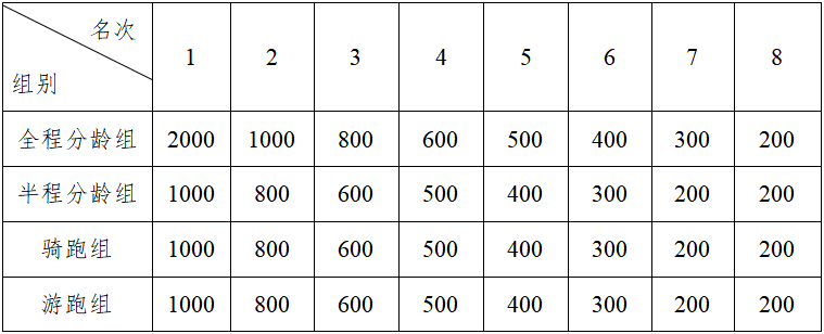 团体按净计时有效成绩录取,并分别获得奖金(见表,单位:人民币/元)。