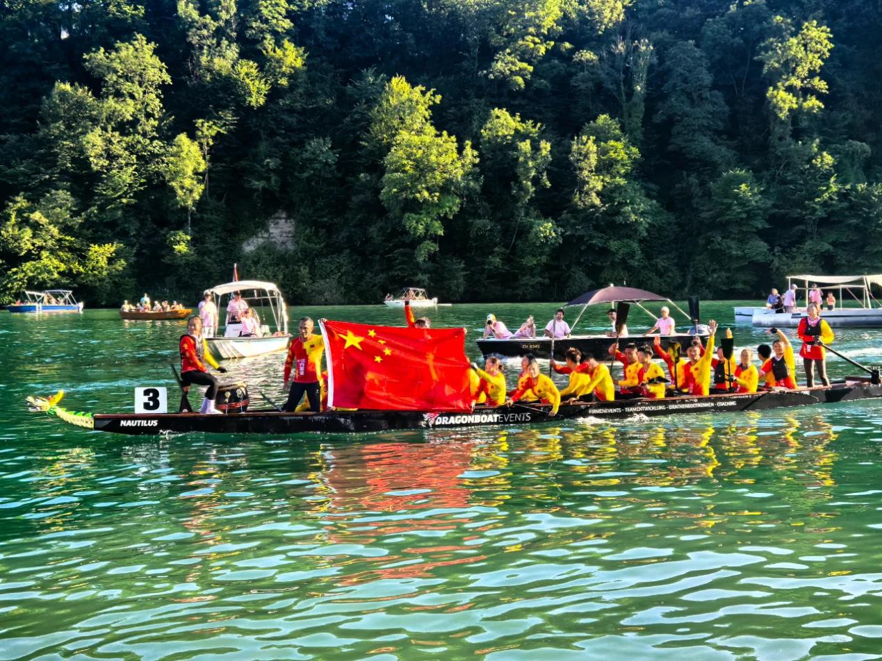 近日,在瑞士举办的第33届艾格丽萨(Eglisau)国际龙舟赛中,中国重庆合川龙舟队与来自世界各地的80支比赛队伍、1500多名选手同场竞技,勇夺国际标准龙400米直道竞速精英赛冠军。(供稿人:谢黎)