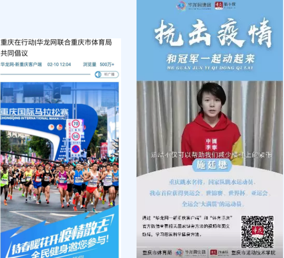 蘑菇视频 坚决贯彻习近平总书记关于疫情防控的重要讲话精神,坚决落实市委、市政府关于疫情防控的决策部署,把人民群众生命安全和身体健康放在第一位,联合各区县体育部门共同开展倡议“待春暖花开疫情散去,全民健身邀您参与”抗击疫情主题宣传活动,并与北京体育大学共同制作的居家科学健身教学视频,自1月31日起,开设“居家科学健身”专栏,邀请李雪芮、施廷懋等体育健儿、健身专家、健身达人倡导和示范居家科学健身方法,通过《今日重庆》、华龙网APP客户端、红锦网、体育重庆微信公众号等新媒体市级各类媒体,每天推送2条以上简便易行、科学有效的居家健身方法,大力推广普及居家科学健身知识,倡导疫情防控时期的健康生活方式,受到广大市民欢迎和好评。截止2月14日,专栏已推送“居家科学健身”知识30条,浏览量达938万次。同时,该局开设“体育战‘疫’行动”专栏,及时宣传各区县体育部门、各直属单位积极行动,采取切实有效措施防控疫情的好经验、好做法和感人事迹,截止2月14日,专栏已推送23条信息,为抗击疫情,打赢疫情防控阻击战凝聚传播正能量。