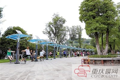 7月30日上午,在江津区鼎山街道高牙社区贾坝沱滨江路上,整齐地摆放着一排智能健身设备,不少市民在此健身。市民在使用健身器材时,设备商的系统将记录运动时间、心率等数据,这些数据还可以实现扫码传输。
