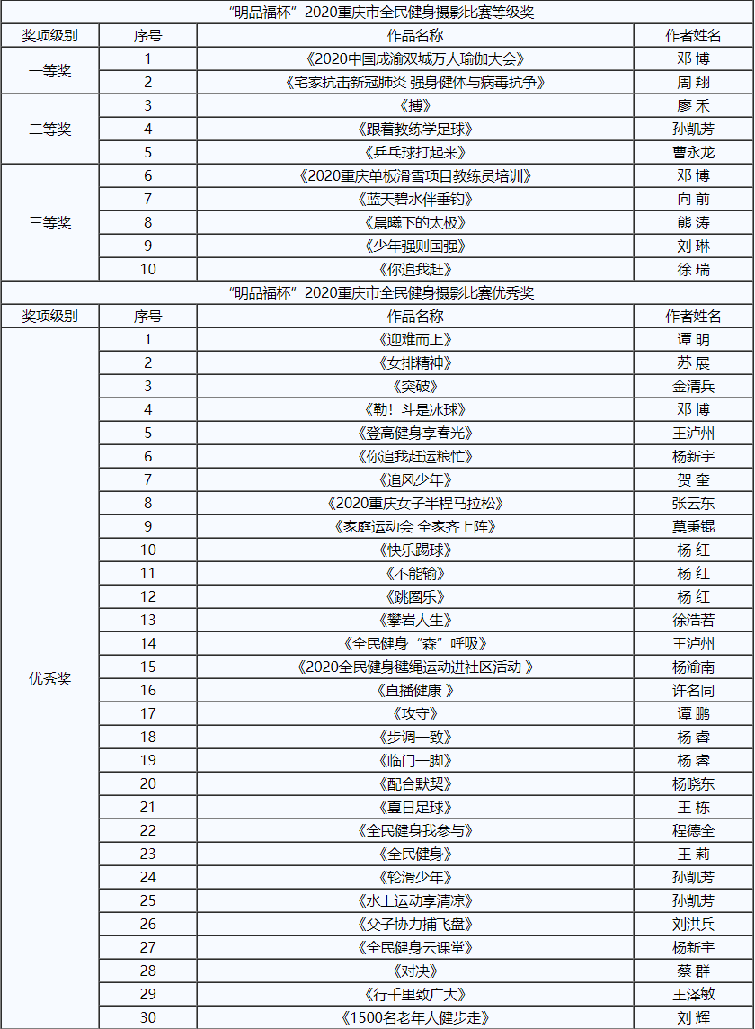 “明品福杯”2020重庆市全民健身摄影比赛获奖作品名单