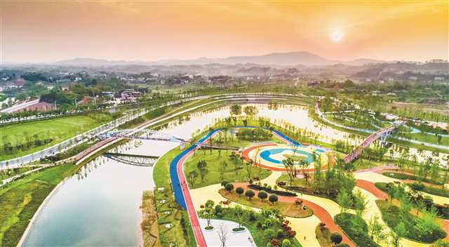 位于淮远河畔的铜梁原乡中央公园,曾是一片荒地,如今,公园修建了约20公里长的滨水健身步道、专业的羽毛球场、篮球场、儿童健身游乐设施,免费向市民游客开放,成为大家向往的城市健身休闲之地。据统计,截至2020年,全区有体育场地3121个,其中农村建有群众体育健身工程254个、健身广场28个,初步构建起10分钟健身圈的健康城市体系。