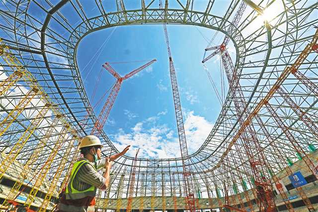 8月18日,重庆龙兴足球场项目重达1.4万吨的罩棚钢结构顺利封顶,全面进入金属屋面及幕墙装饰装修施工阶段。图为技术人员正在进行最后的吊装工作。