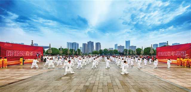 伴着悠扬的音乐,身着统一的太极服,铜梁区人民公园内,太极拳表演者精神饱满,用一招一式诠释着太极拳的魅力。这是“明品福杯”2021重庆市全民健身摄影比赛的投稿作品。