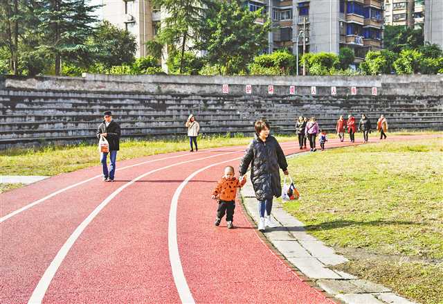 近日,巴南区莲花街道大江足球场,市民在新修的跑道上散步。该球场此前年久失修,长期荒废,不久前经改造、修缮恢复使用功能后成了周边居民休闲健身好去处。