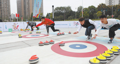 10月12日,在重庆永川,市民体验旱地冰壶运动。
