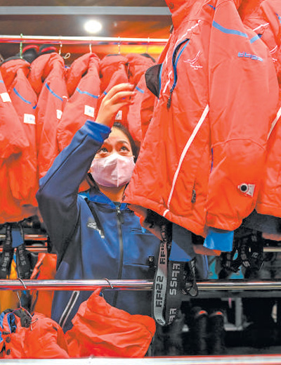 11月15日,工作人员在吉林长白山国际度假区内整理滑雪服。