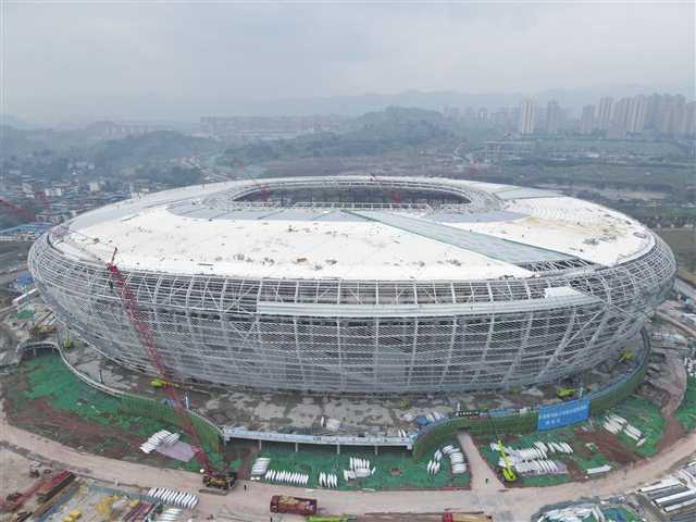 龙兴足球场完成主体和钢结构施工、外立面1.2万平方米示范幕墙已盛装亮相、场馆建设进度领跑“亚洲杯”6个新建场馆……