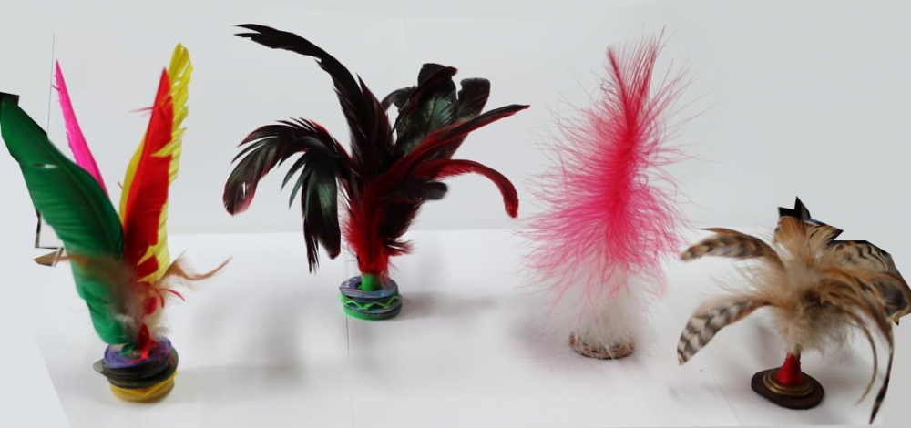 另外一个羽毛比较软,比鸡毛略长,这是用雕翎做的,羽毛的韧性会更好,不容易损坏,羽毛高度和宽度更适合完成更多的花式动作,邓丹目前经常用这种毽子。在她的心目中,这些毽子并不是说花多少钱可以买到,每一个都是自己做的,包含了很多心血。