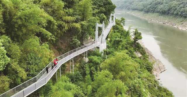 在北碚区的嘉陵江畔,有一条沿江而建的网红步道——北碚区嘉陵江巡江步道,步道沿着高峻的温塘峡崖壁蜿蜒,下方碧绿的嘉陵江缓缓流淌,自今年4月底开放以来,每天都会吸引众多市民前往休闲健身打卡。在北碚,像这样建在家门口的健身步道逐年递增,目前已累计建成40条。