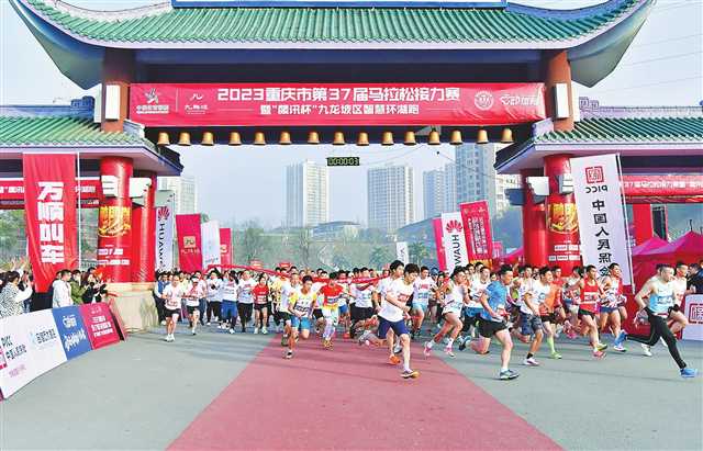 3月4日,2023重庆市第37届马拉松接力赛暨“飙讯杯”九龙坡区智慧环湖跑,在九龙坡区华岩风景区西门(龙门阵广场)鸣枪开跑,来自269支代表队的近3000名跑友在环华岩湖赛道展开角逐,上演“速度与激情”。图为比赛现场。文/记者 赵迎昭(组委会供图)