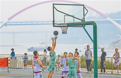 5月20日,重庆市渝中区菜园坝街黄沙溪江畔,市民在球场打篮球。近年来,渝中区黄沙溪片区通过“两江四岸”治理提升,江畔建起球场和健身步道,吸引众多市民前来休闲健身,享受运动乐趣。