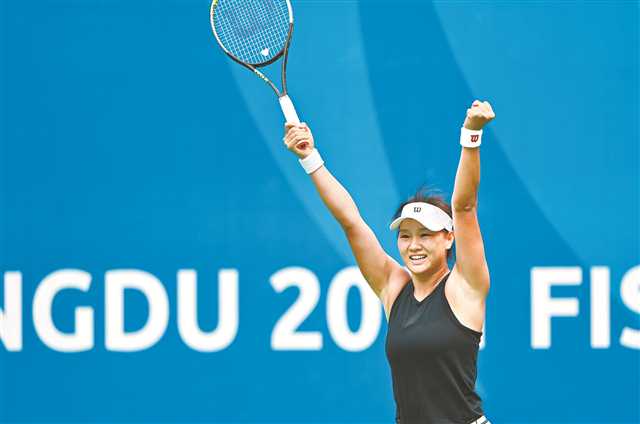 8月6日,成都大运会网球女子单打决赛,比赛结束郭涵煜庆祝胜利。首席记者 龙帆 摄/视觉重庆