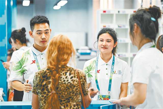 7月27日,成都大运会大运村代表团服务中心,四川外国语大学志愿者邓林巧(中)正在为代表团服务。首席记者 龙帆 摄/视觉重庆