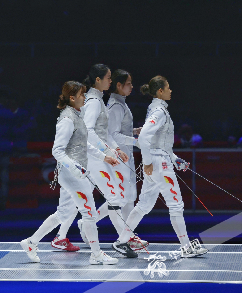 王英璎(左一)和队友一起获得杭州亚运会女子团体花剑冠军。华龙网特派记者张质摄