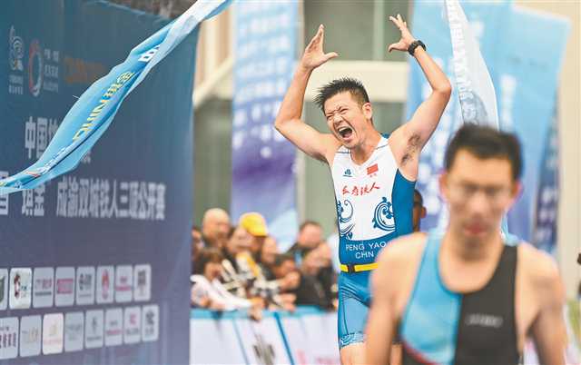 10月22日,成渝双城铁人三项公开赛中,参赛选手冲过终点激动不已。