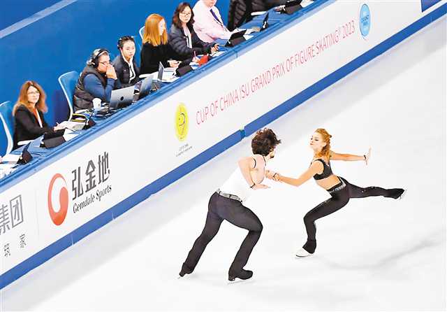 11月10日,重庆华熙文化体育中心,2023中国杯世界花样滑冰大奖赛现场,选手贴近裁判席展示。