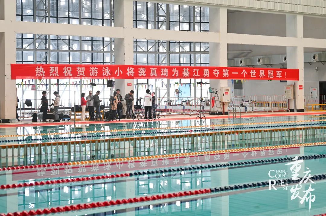 重庆市綦江区游泳馆挂出横幅,祝贺龚真琦成为綦江区体育史上首个世界冠军,也是重庆市体育史上首个FINA游泳世锦赛游泳项目的冠军。邹乐 摄