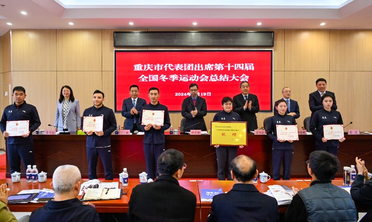 会上,市体育局党组书记、局长,重庆代表团副团长丁洪作参赛总结报告,市体育局一级巡视员、代表团副团长兼秘书长张欣宣读《关于奖励我市参加第十四届全国冬季运动会获奖集体和个人的决定》,“十四冬”五冠王、越野滑雪运动员王强,市冬运中心副主任、越野滑雪领队张歌分别发言。
