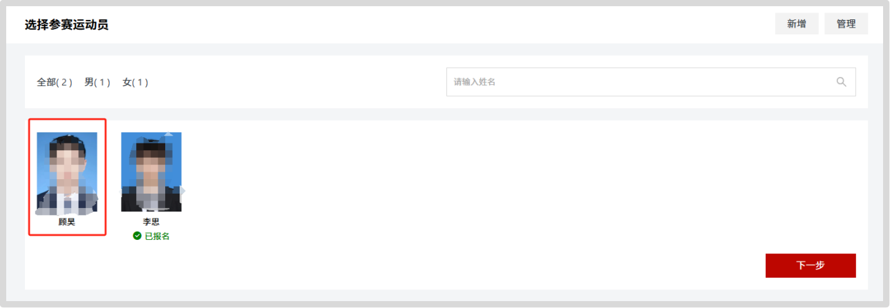 (四)点击“新增”添加运动员,按要求填写信息。选择运动员,进入下一步。