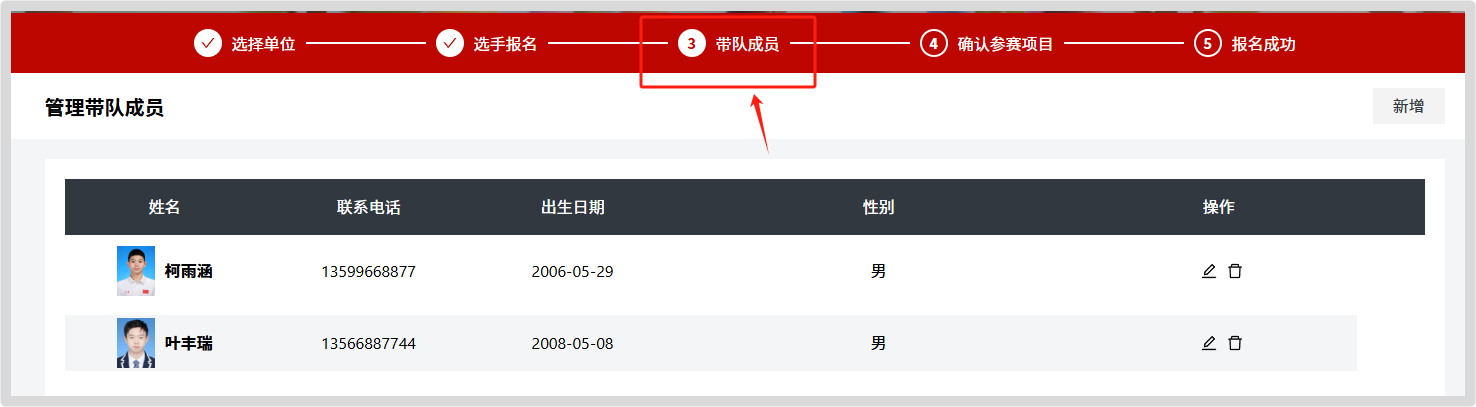 (五)点击“新增”添加带队人员,按要求填写信息。添加完成后,点击“带队成员”