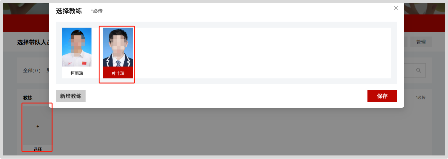 (四)点击教练下的灰色块,在带队人员列表中选择教练,点击“保存”,出现头像代表选择成功,领队同上。检查无误后提交,报名完成。