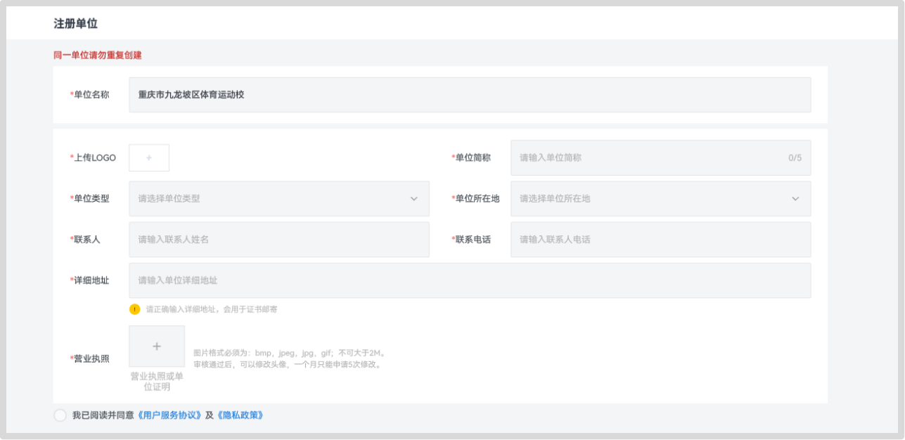 (二)在单位注册页面中,按要求填写信息,确认无误后点击“提交”。注:同一单位请勿重复注册!审核时将随机删除多余账号。